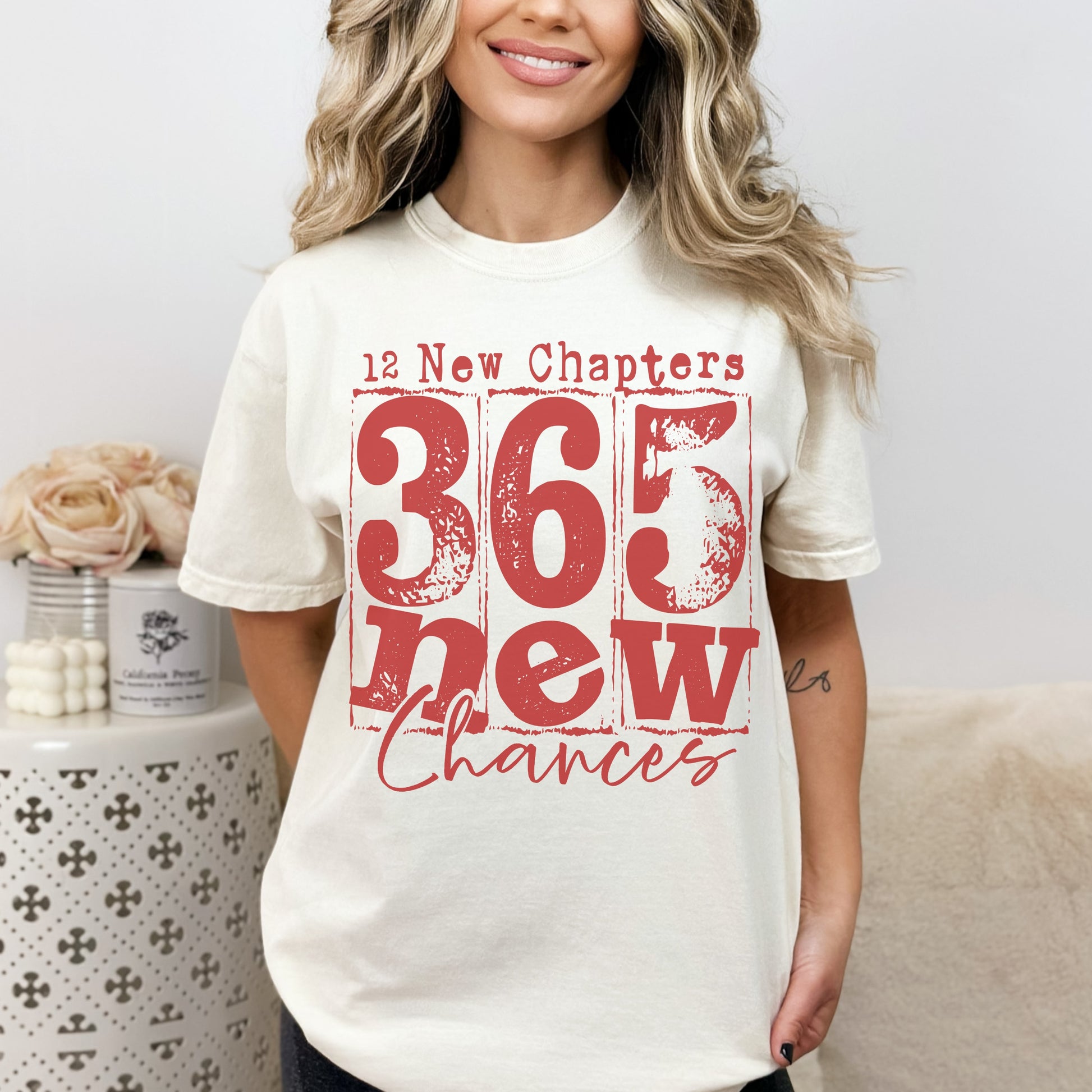 Bold, distressed typography on soft garment-dyed cotton - not a trend, a mindset. 12 New Chapters. 365 New Chances. It's the permission you've been waiting for, printed where you can see it every morning.