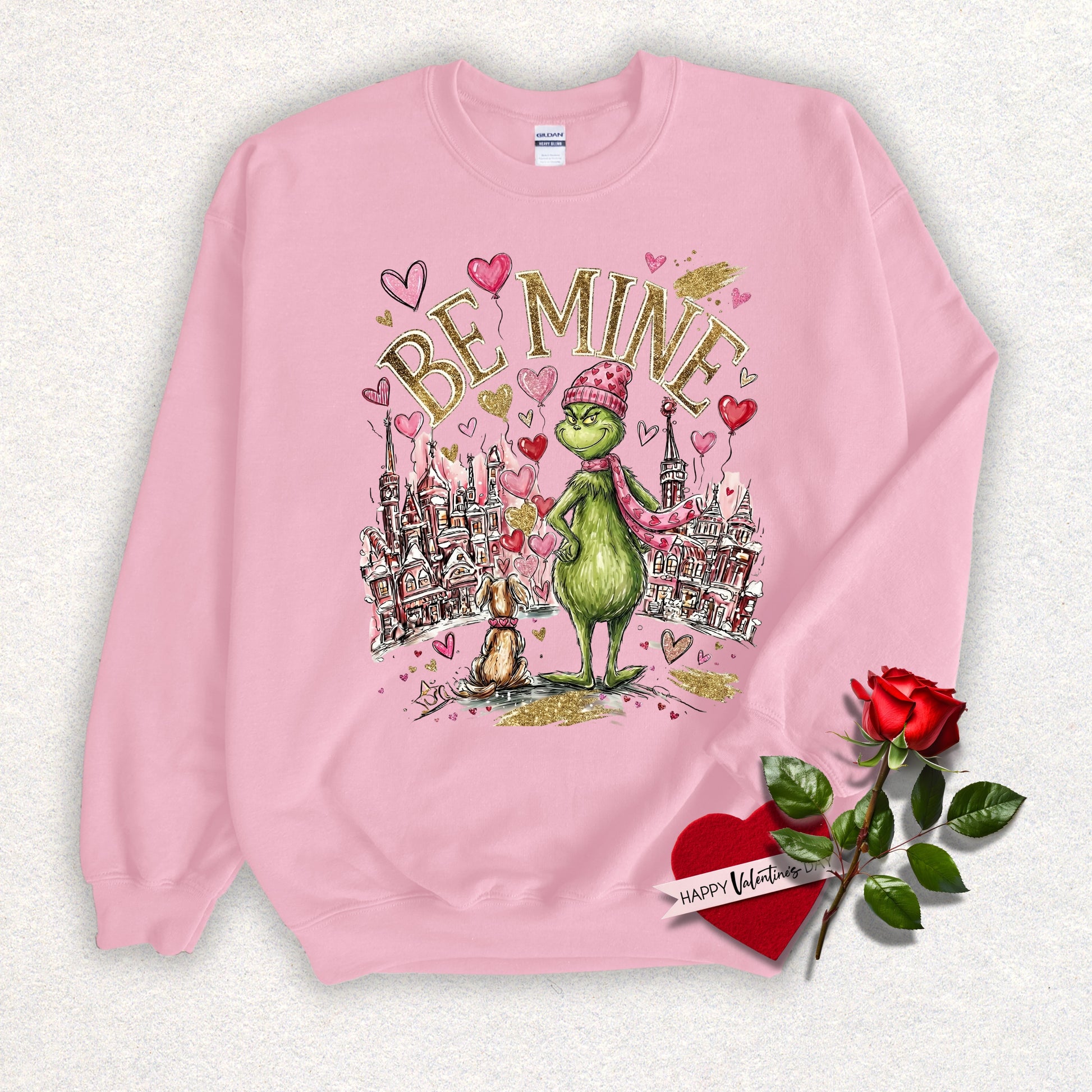Design Details: Our favorite green character strikes a pose with his furry friend beneath a dreamy "BE MINE" arch, backed by an enchanting pink castle town. Scattered hearts in pink, coral, and gold glitter create a magical Valentine's atmosphere. The bold red sweatshirt makes all the details pop beautifully!