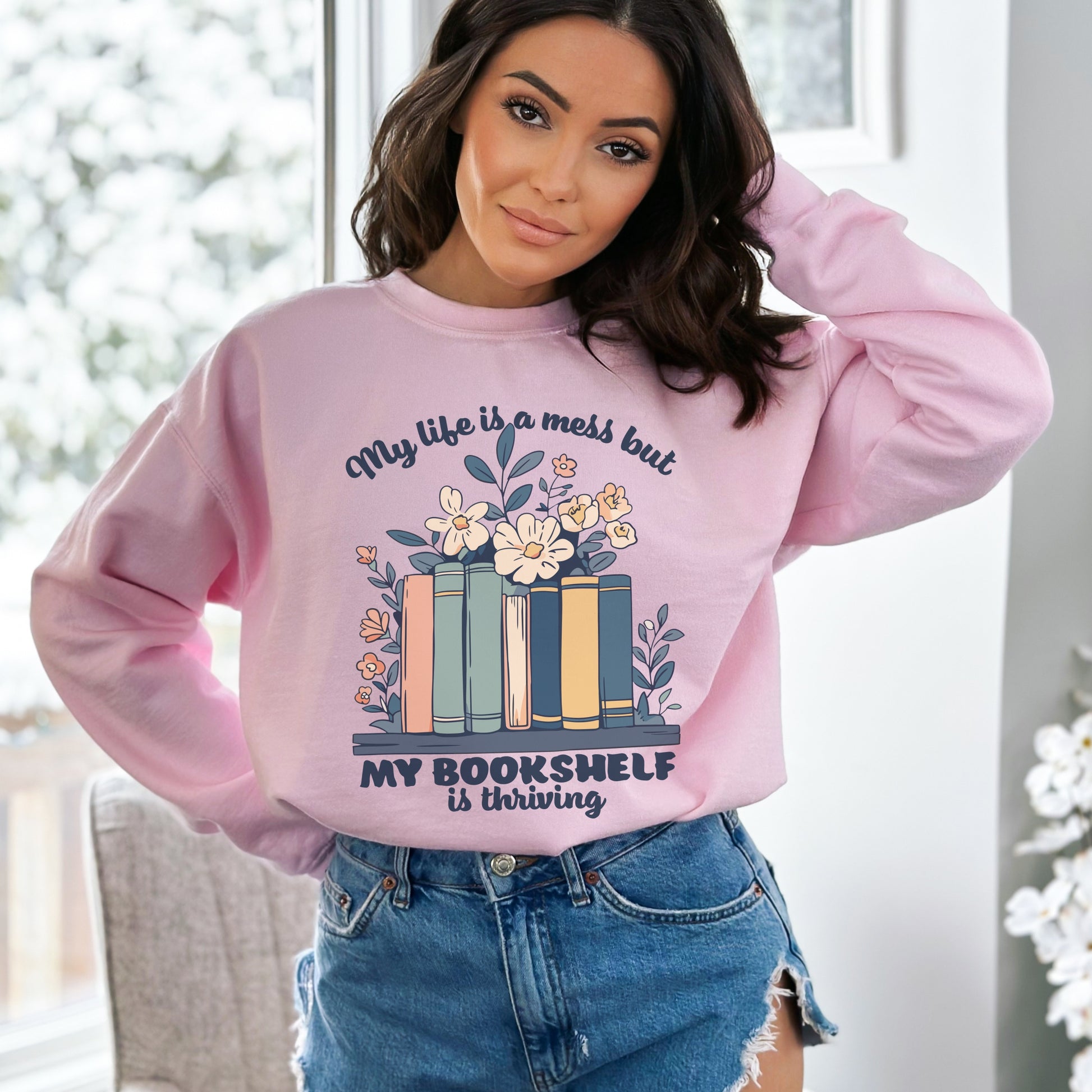 Elevate your cozy wardrobe with this delightful unisex crewneck sweatshirt, perfect for book lovers and anyone who appreciates a touch of whimsy in their style. The charming design features a colorful bookshelf adorned with flowers, reminding you that even amidst life's messiness, your love for reading is thriving. Crafted for both comfort and durability, this sweatshirt is made from a soft 50/50 cotton-polyester blend, ensuring you feel as good as you look. Whether you're curled up with a good book on a quiet evening or out and about with friends, this classic crewneck is a versatile staple that pairs effortlessly with jeans or joggers. Ideal for casual hangouts, book clubs, or cozy holidays like National Book Lovers Day, it's a thoughtful gift for friends, family, or even yourself!