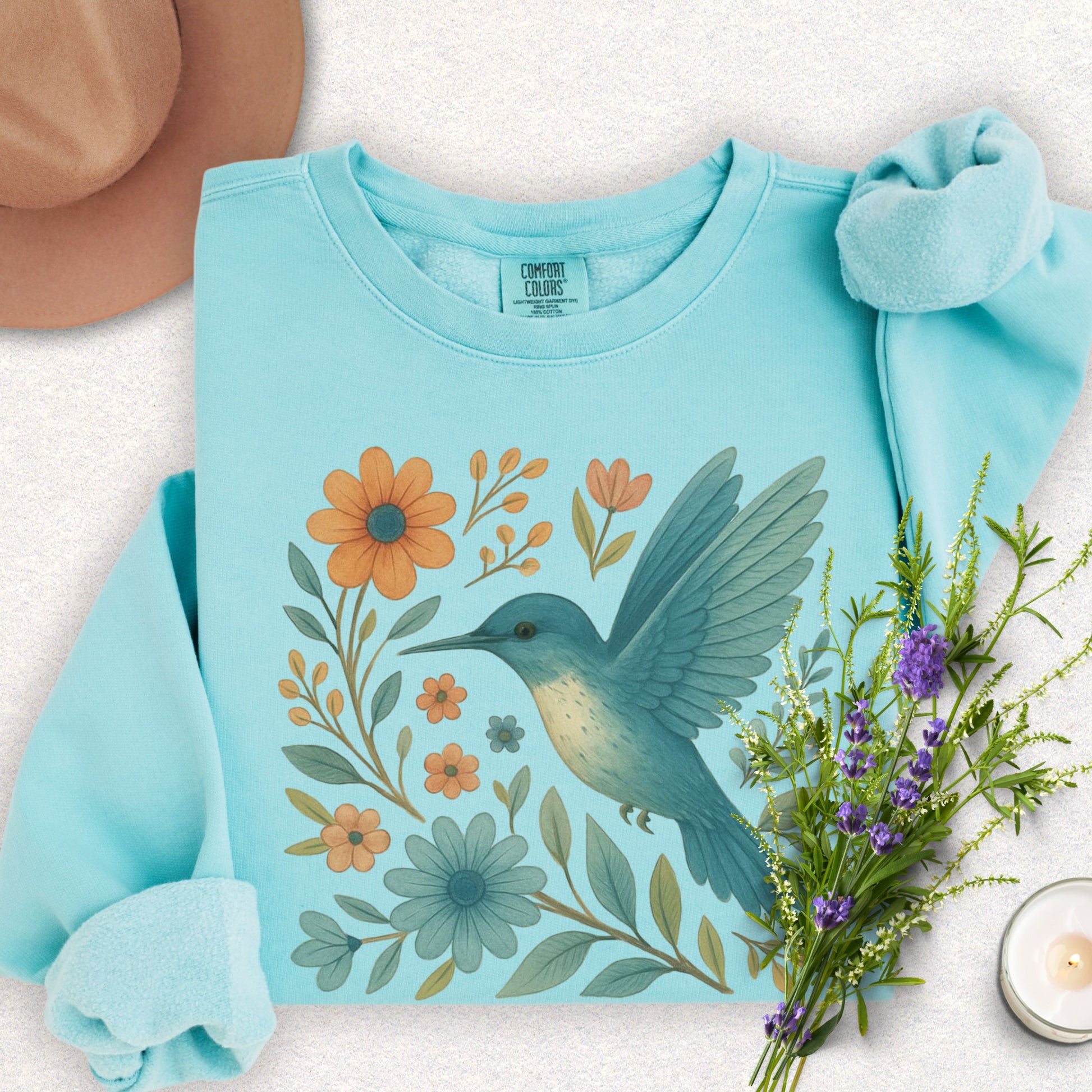 This sweatshirt features a beautiful hummingbird in flowers design, giving off a serene and nature-inspired vibe. Perfect for those who love nature and want to add a touch of beauty to their wardrobe. Ideal for nature lovers, bird enthusiasts, and those who appreciate floral motifs. Great for casual wear, lounging at home, or as a layering piece during chilly weather. Suitable for gifting on occasions such as birthdays, Mother's Day, or as a thoughtful thank you gift.