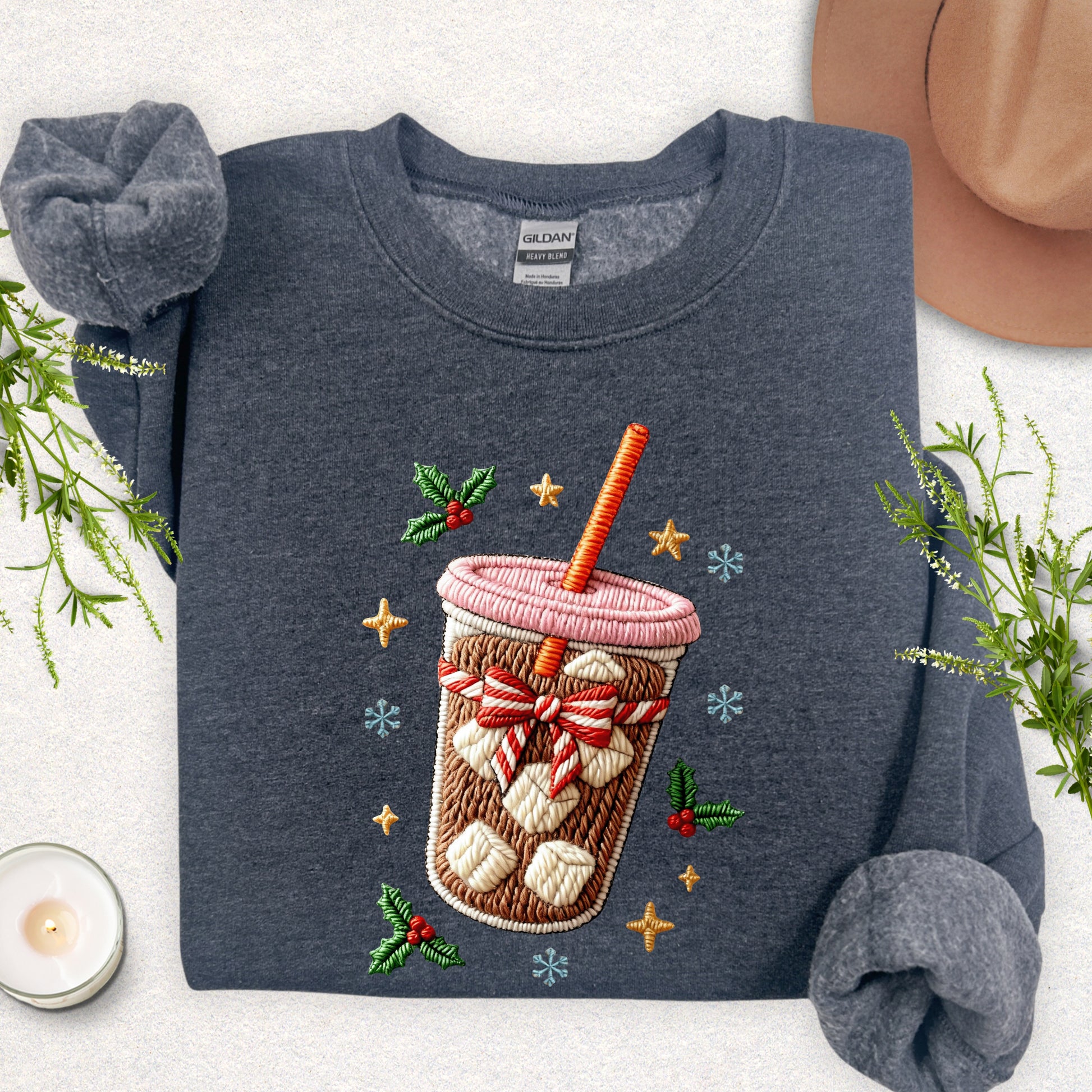 This delightful design showcases an iced coffee cup adorned with a cozy cable-knit sleeve and peppermint bow, surrounded by twinkling stars, delicate snowflakes, and sprigs of evergreen. Every element features detailed faux yarn texture that mimics hand-stitched embroidery, giving your sweatshirt a premium, crafted-by-hand appearance.