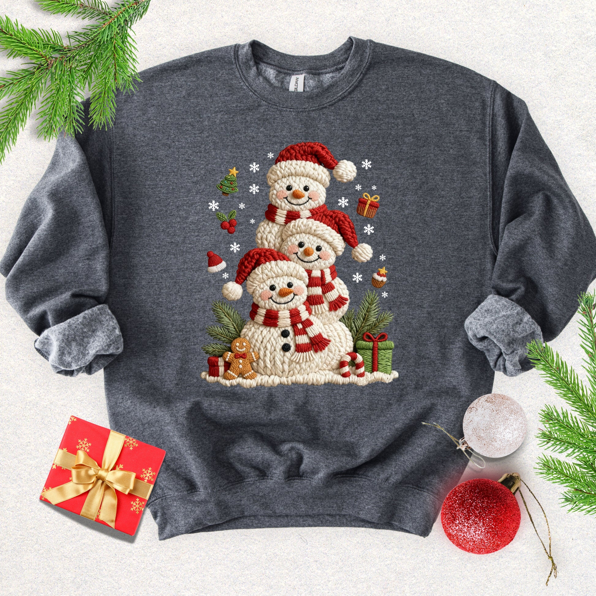 A cozy, heartwarming crewneck sweatshirt that brings soft winter charm to everyday wear. The front features a textured illustration of three smiling snowmen stacked like a little family, wearing knit hats and scarves amid falling snowflakes and tiny gifts. The mid-weight cotton-poly blend feels substantial without being bulky, and the ribbed collar and double-needle stitching hold shape through repeated wear. Neutral, warm background color keeps the design gentle and wearable while the tear-away label prevents itch. This sweatshirt settles into slow evenings by the fire, cheerful cookie-baking mornings, and casual strolls past twinkling lights — a wearable reminder of simple, homey holiday moments.