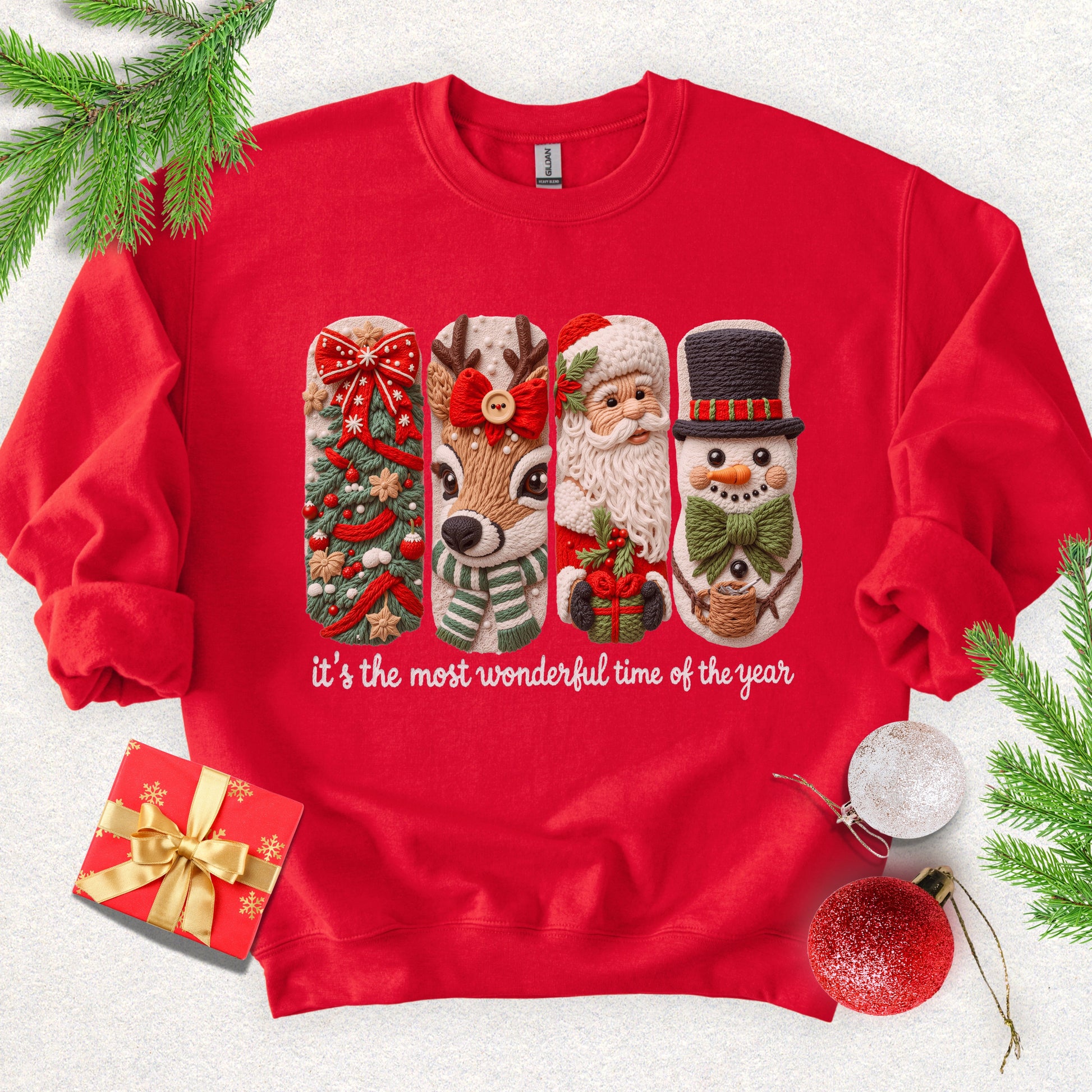 A soft, cozy crewneck that brings a warm, playful holiday spirit to quiet mornings and bustling family gatherings. The white, medium-weight blend holds detailed artwork — a festive lineup of a decorated tree, reindeer, Santa, and snowman framed like knitted stockings — with clear, vibrant DTG print and optional embroidery placement if you want a subtle stitched accent. The classic fit and ribbed collar sit comfortably under a winter coat or over a favorite tee, while the tear-away label keeps it itch-free. Wear it while wrapping presents, sipping cocoa by the tree, or during relaxed holiday movie nights — it keeps the mood light and familiar without trying too hard.