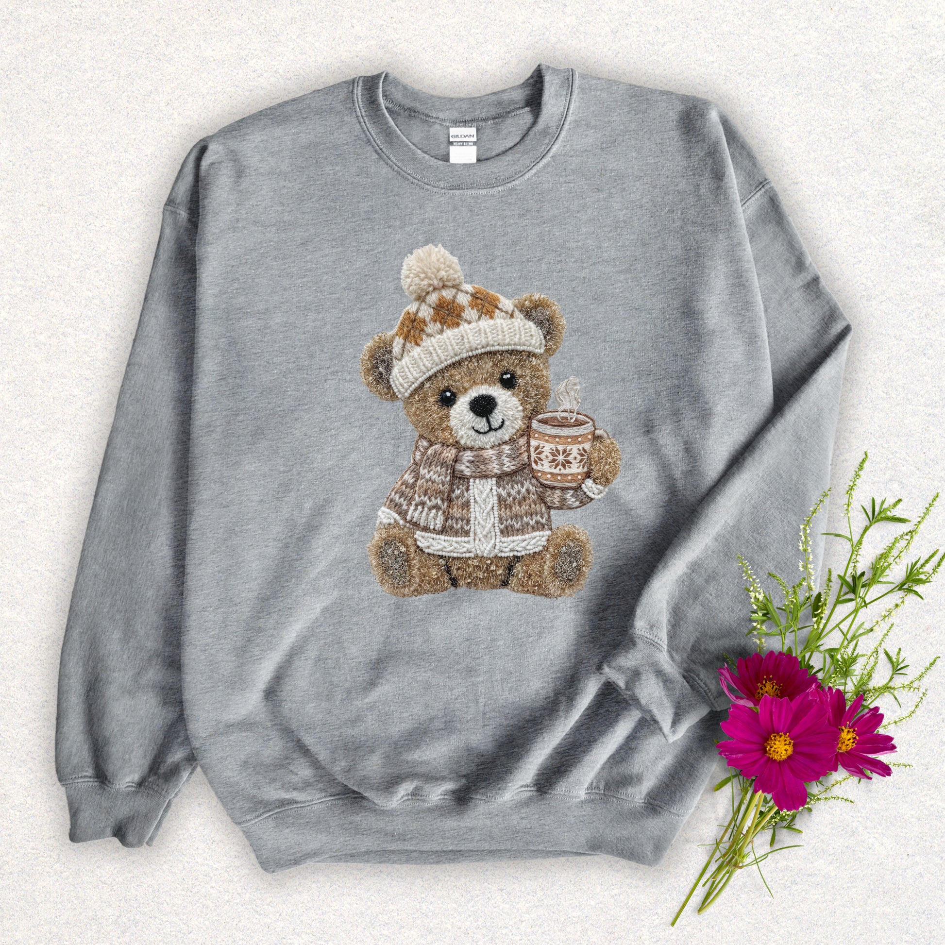 This Faux Yarn Bear Sweatshirt features an irresistibly charming teddy bear bundled up in a knit hat and scarf, holding a warm mug - designed to look like soft, hand-stitched yarn embroidery. The faux knit artwork gives all the cozy, textured vibes of a sweater illustration while keeping the comfort of your favorite sweatshirt.