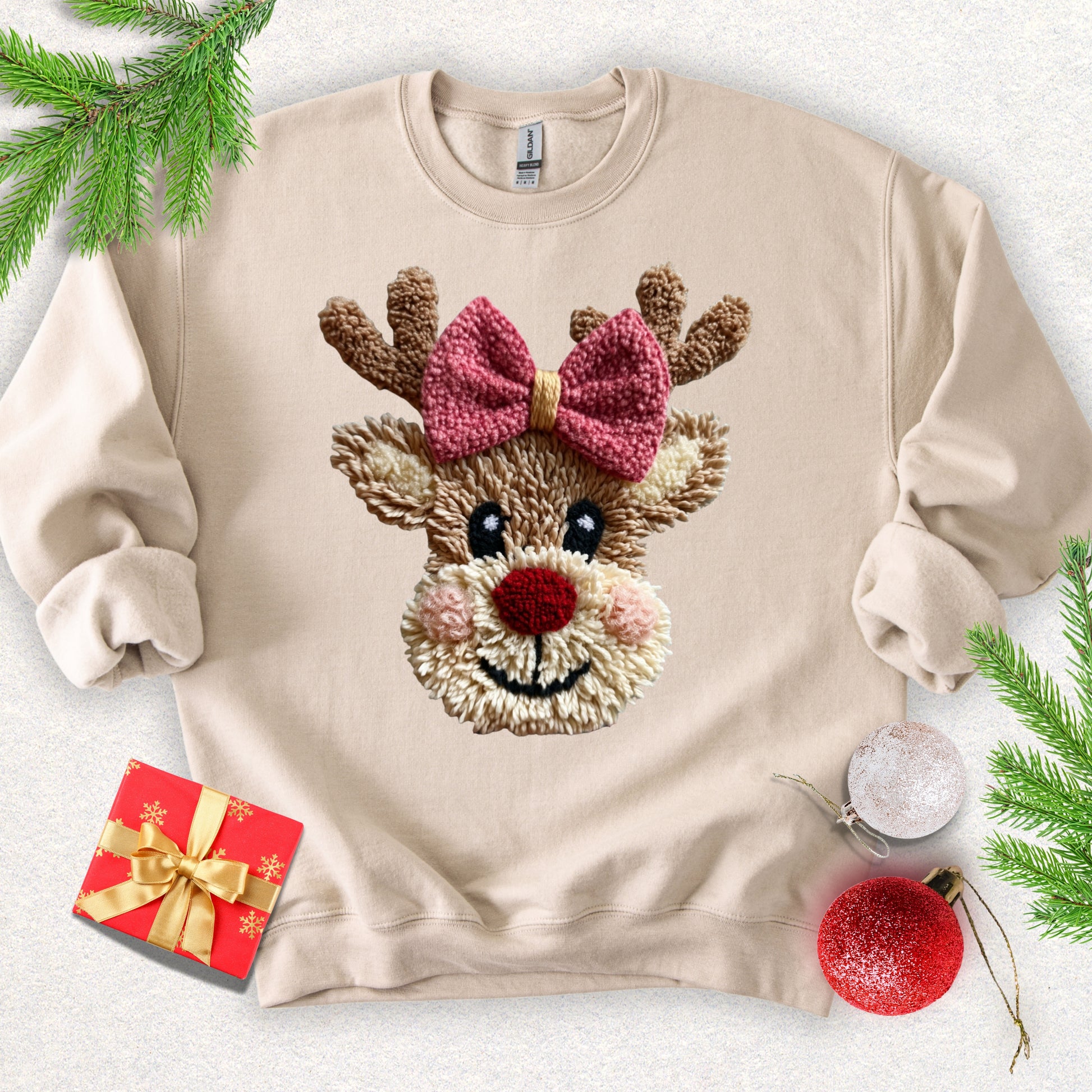 Soft, cozy, and quietly joyful — this crewneck sweatshirt brings a warm, whimsical touch to chilly days. The front features a textured reindeer face with a rosy nose and a hand-tied-looking bow, giving the design a playful, homespun vibe. The medium-heavy 50/50 cotton-poly fabric feels substantial without weighing you down, and the classic fit and crew neckline layer easily over shirts or stand on its own as a statement of gentle holiday cheer.