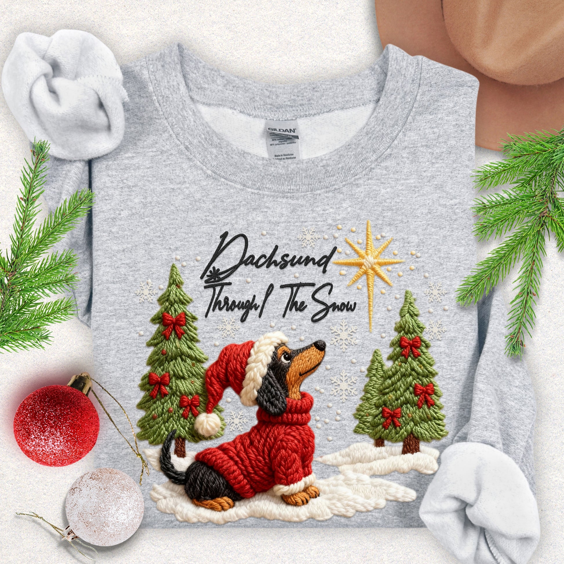 Soft, cozy, and a little bit cheeky — this crewneck brings a warm, wintry scene to your everyday wear. A dachshund in a knit sweater sits proudly in fresh snow, flanked by fir trees and a glowing star. The print’s painterly details and subtle color palette give it a handmade, storybook feel that slips easily into quiet holiday mornings, brisk walks, and living-room movie nights. Lightweight enough for layering, yet substantial enough to keep the chill off, this sweatshirt wears like a familiar hug and adds a touch of seasonal charm without shouting for attention.