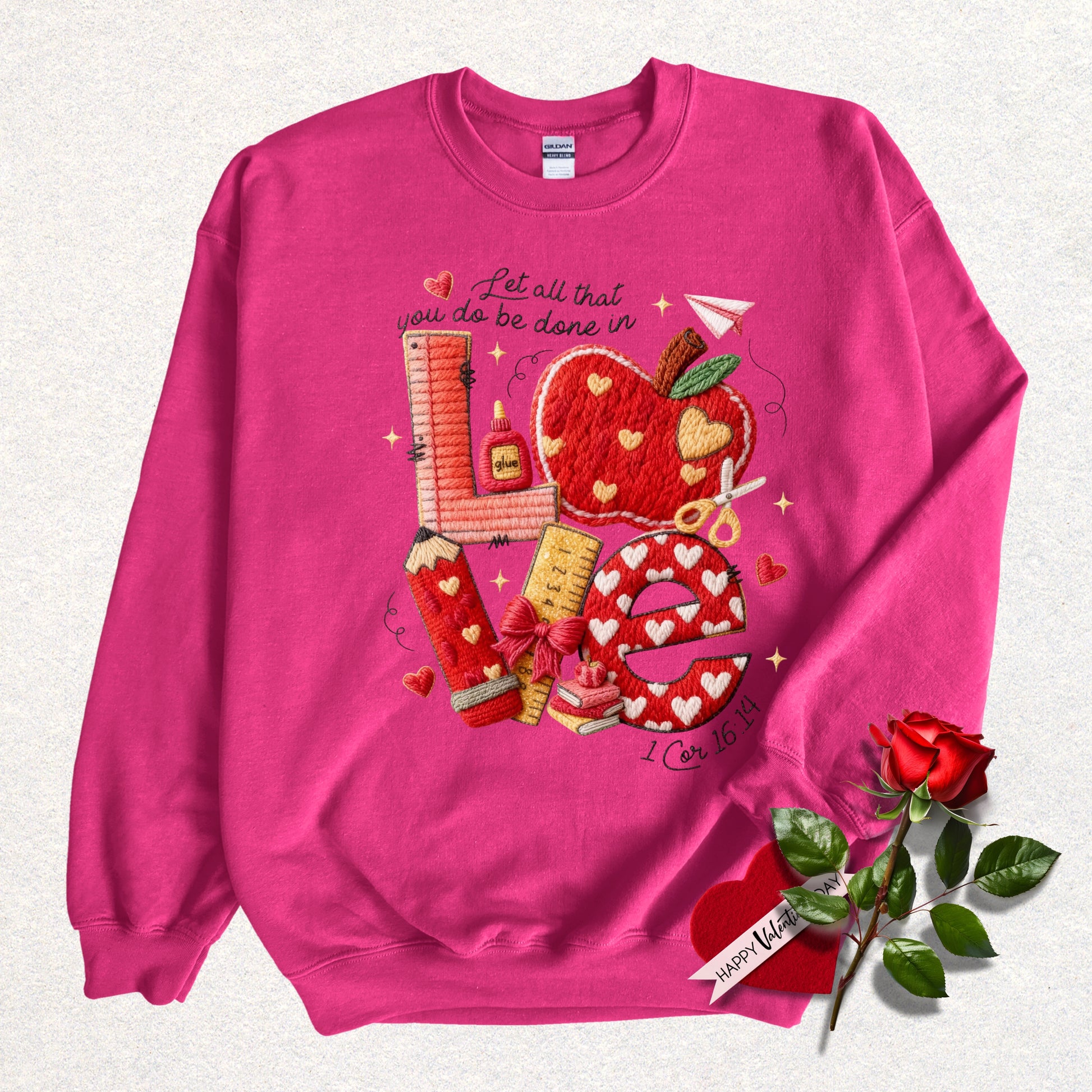Celebrate the educators who give their heart to teaching with this charming Valentine's sweatshirt featuring our signature faux embroidered "LOVE" design. Each letter is thoughtfully crafted with adorable teacher-themed elements - from apples and glue bottles to notebooks and pencils - all adorned with sweet heart details.