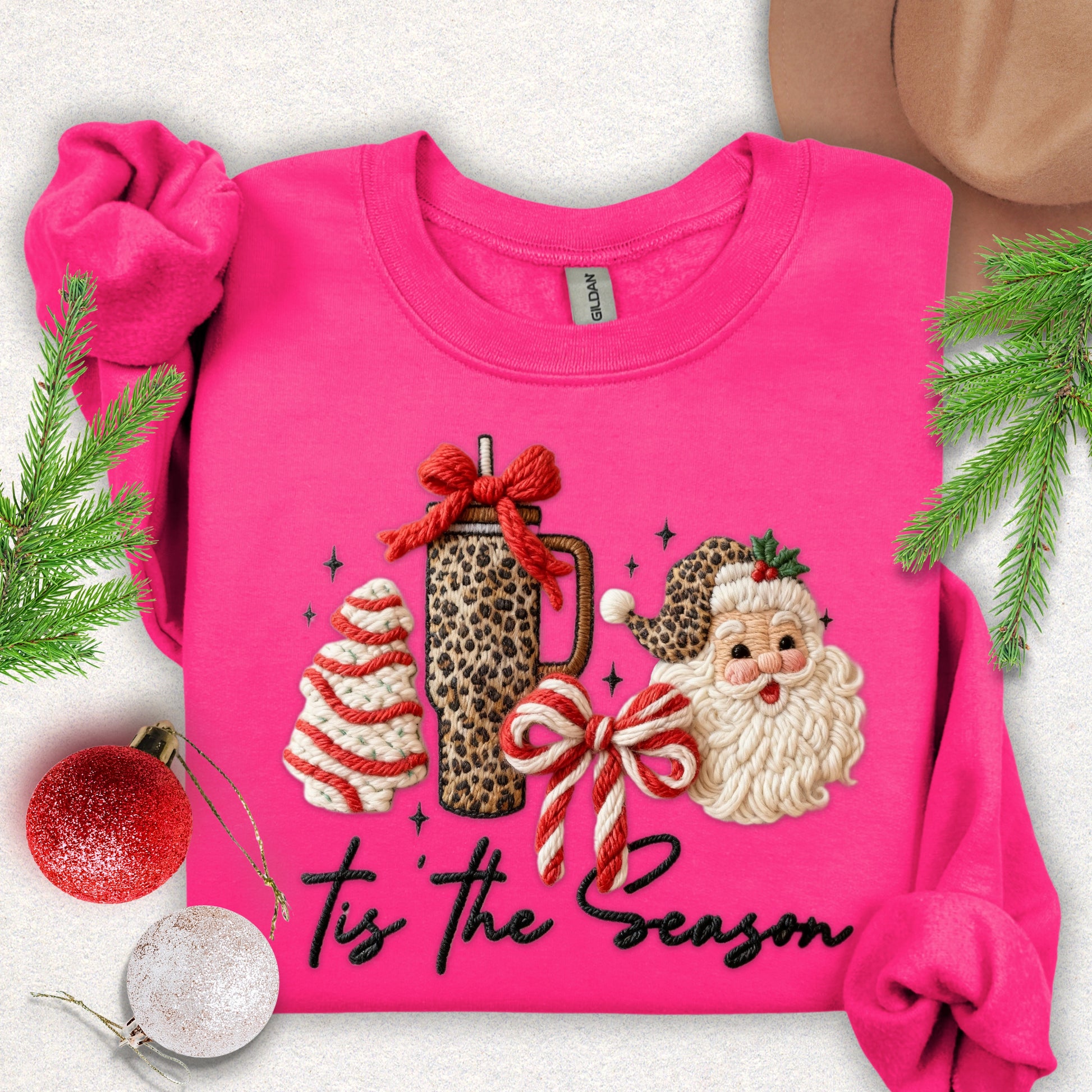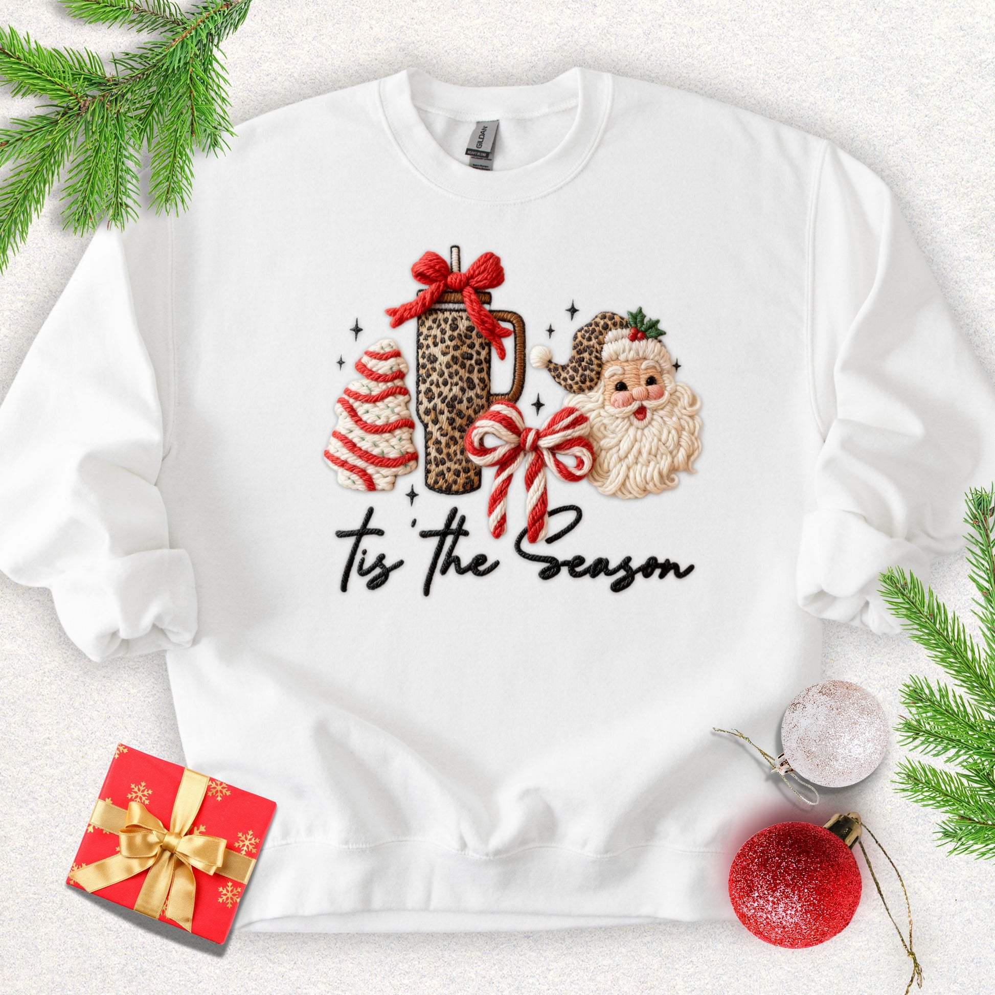 Soft, cozy, and quietly festive — this crewneck brings a gentle holiday moment to every easy morning. The white sweatshirt features an embroidered seasonal vignette: a speckled travel mug wrapped with a bow, a vintage-style Santa face, and a ribboned candy-cane tree, with handwritten ’tis the season’ lettering beneath. The medium-heavy cotton-poly blend feels warm without weight, and the classic crew cut keeps the look clean and wearable. Wear it to slow-down weekends, cookie-baking afternoons, or low-key holiday markets. It’s the kind of sweatshirt you reach for when you want comfort that still feels thoughtful and a little nostalgic.