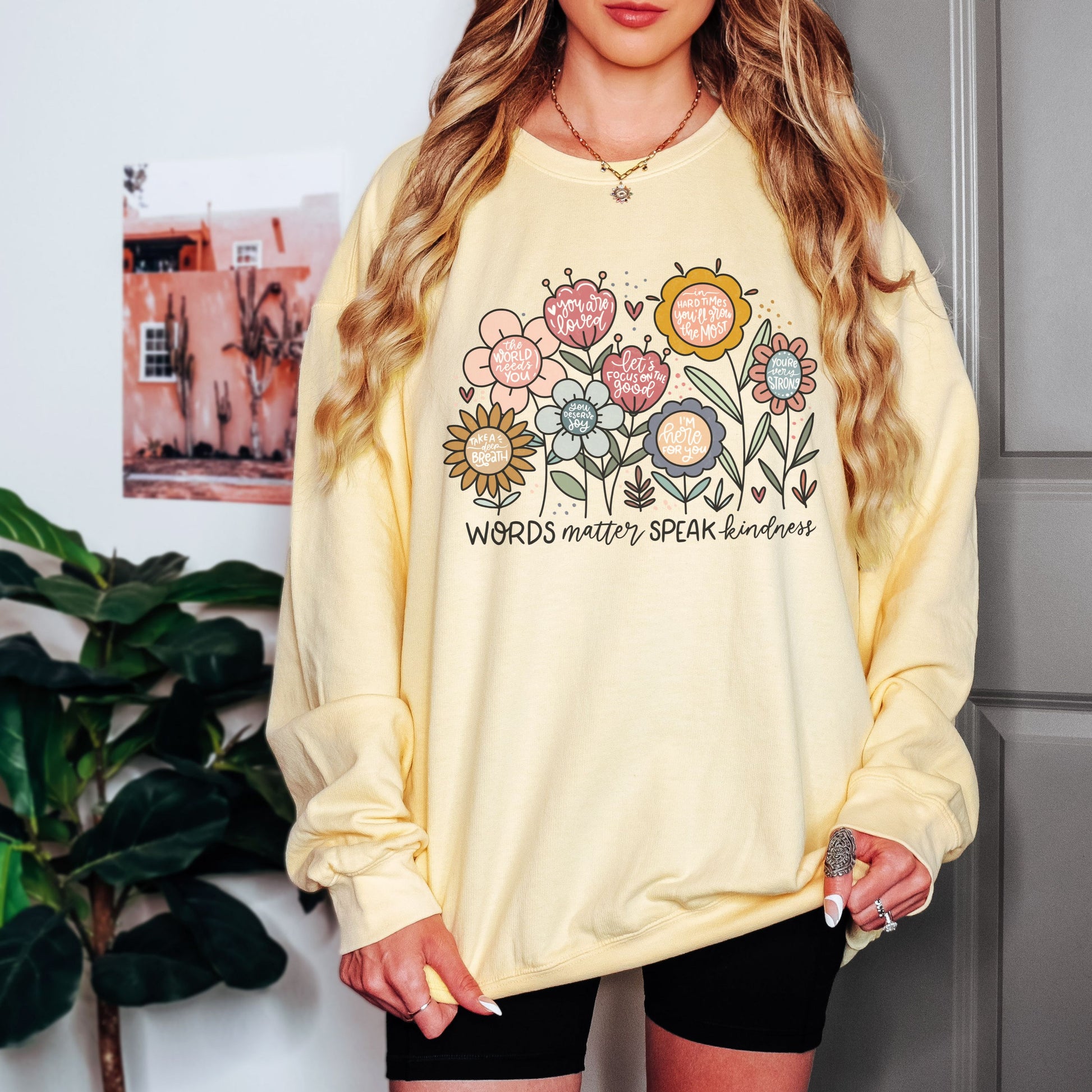 Introducing our Unisex Lightweight Crewneck Sweatshirt, the perfect blend of comfort and style. This sweatshirt features a beautiful floral design accompanied by the inspirational phrase, "Words matter, SPEAK kindness." It radiates positivity, making it an ideal choice for anyone who values kindness and self-expression in their wardrobe. Whether you're lounging at home, running errands, or meeting friends, this relaxed-fit sweatshirt wraps you in warmth and a touch of cheer. Great for casual outings or cozy moments at home, it suits all seasons!