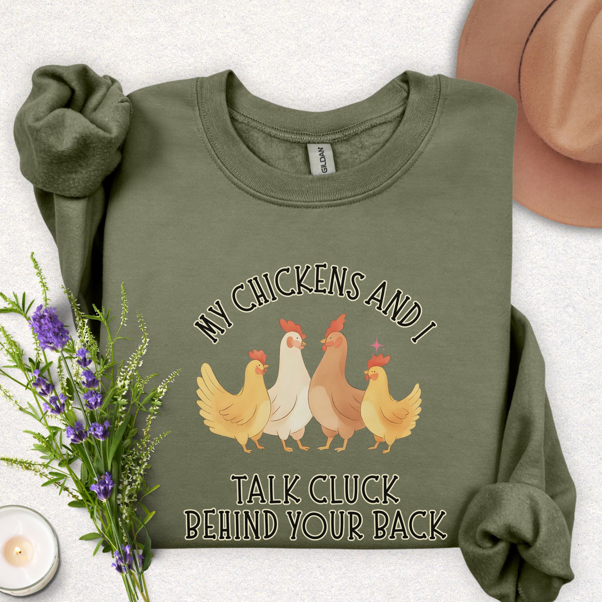 Embrace cozy comfort with this delightful Crewneck Sweatshirt, perfect for all chicken lovers! Featuring a whimsical design that reads, "My chickens and I talk cluck behind your back," it adds a playful touch to your wardrobe. This soft and durable sweatshirt is ideal for lounging at home or casual outings with friends. Made from a cozy cotton-poly blend, it keeps you warm during those chilly days.