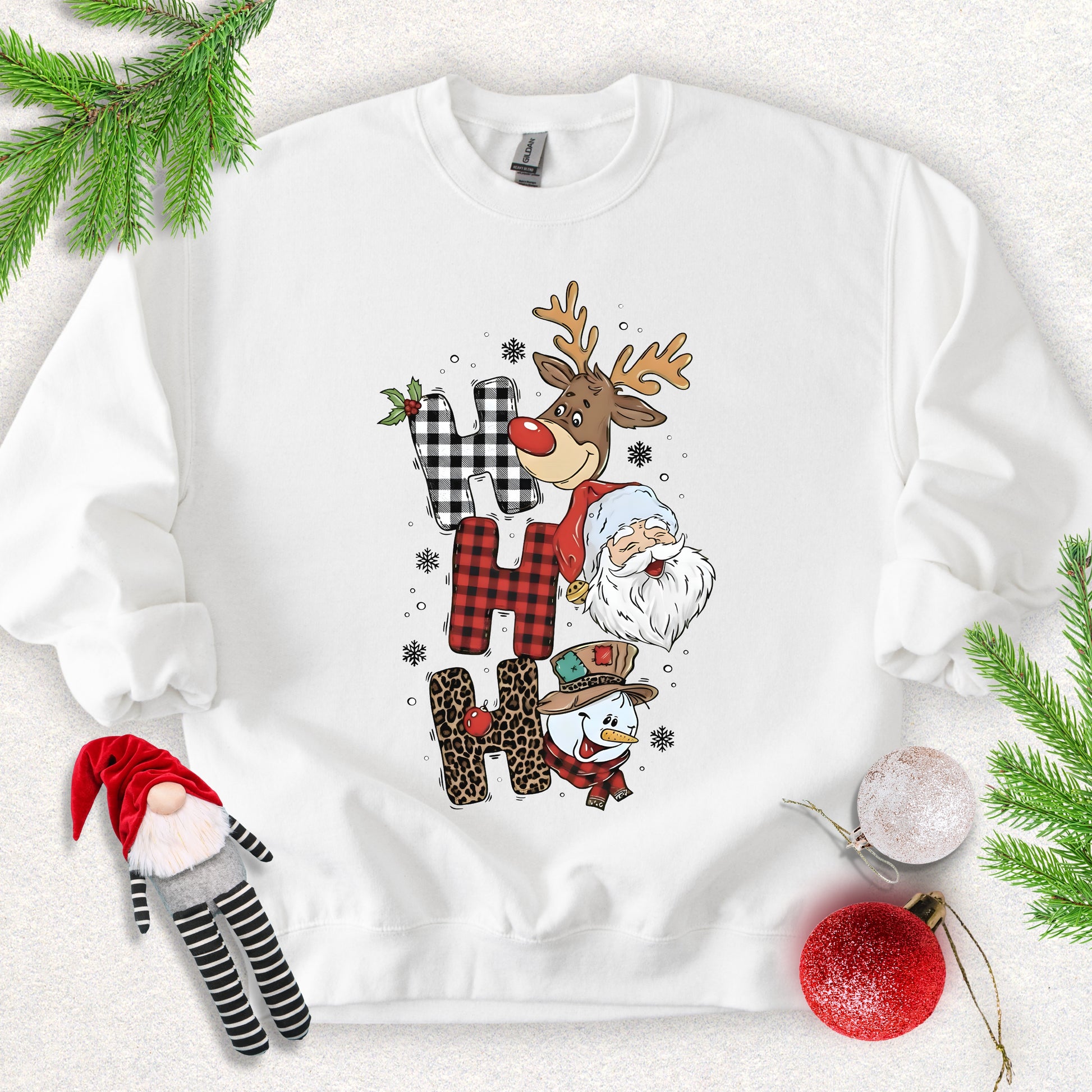 Soft, cozy, and quietly festive — this crewneck sweatshirt wraps you in familiar holiday warmth. The front artwork stacks three playful ‘Ho’ letters in buffalo plaid and knit textures, mingled with a reindeer, Santa and a snowman peeking between the letters. Light snowflakes dot the scene for a gentle, wintry feel. The sweatshirt’s medium-heavy fabric and classic crew cut make it comfortable for slow mornings by the tree, evening strolls through twinkling neighborhoods, or relaxed family gatherings during the holiday season. Subtle details — like durable double-needle stitching, a stretch-retaining ribbed collar, and a tear-away label — keep it feeling lived-in and comfortable year after year.