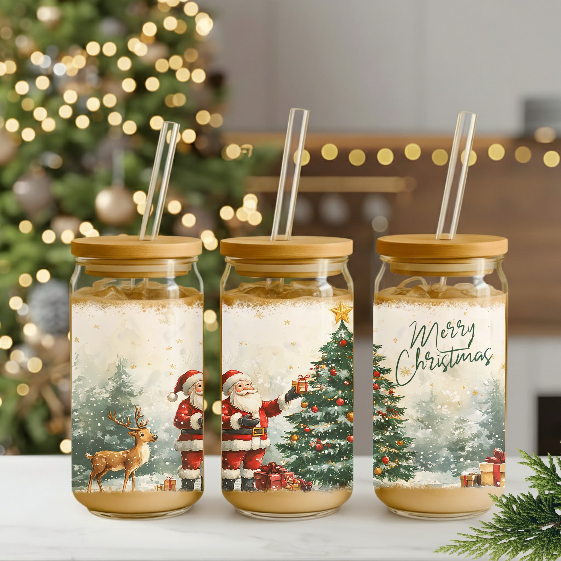 This 16oz sipper glass brings cozy holiday scenes to your daily sip. Clear tempered glass showcases a vintage-style Christmas print - twinkling tree, Santa, and woodland friends, so every drink feels like a quiet moment beside the tree. Choose the natural bamboo push lid with a clear Tritan straw for spill-reduced, on-the-go enjoyment, or leave it lid-free for easy pouring and handwashing. Lightweight and durable, the glass holds a full serving of your favorite cold beverages while preserving bright, true-to-design color. Made in the USA from globally sourced materials and BPA-free, it’s a simple, seasonal way to add warmth to coffee breaks, cookie-baking mornings, winter craft sessions, and holiday gatherings.