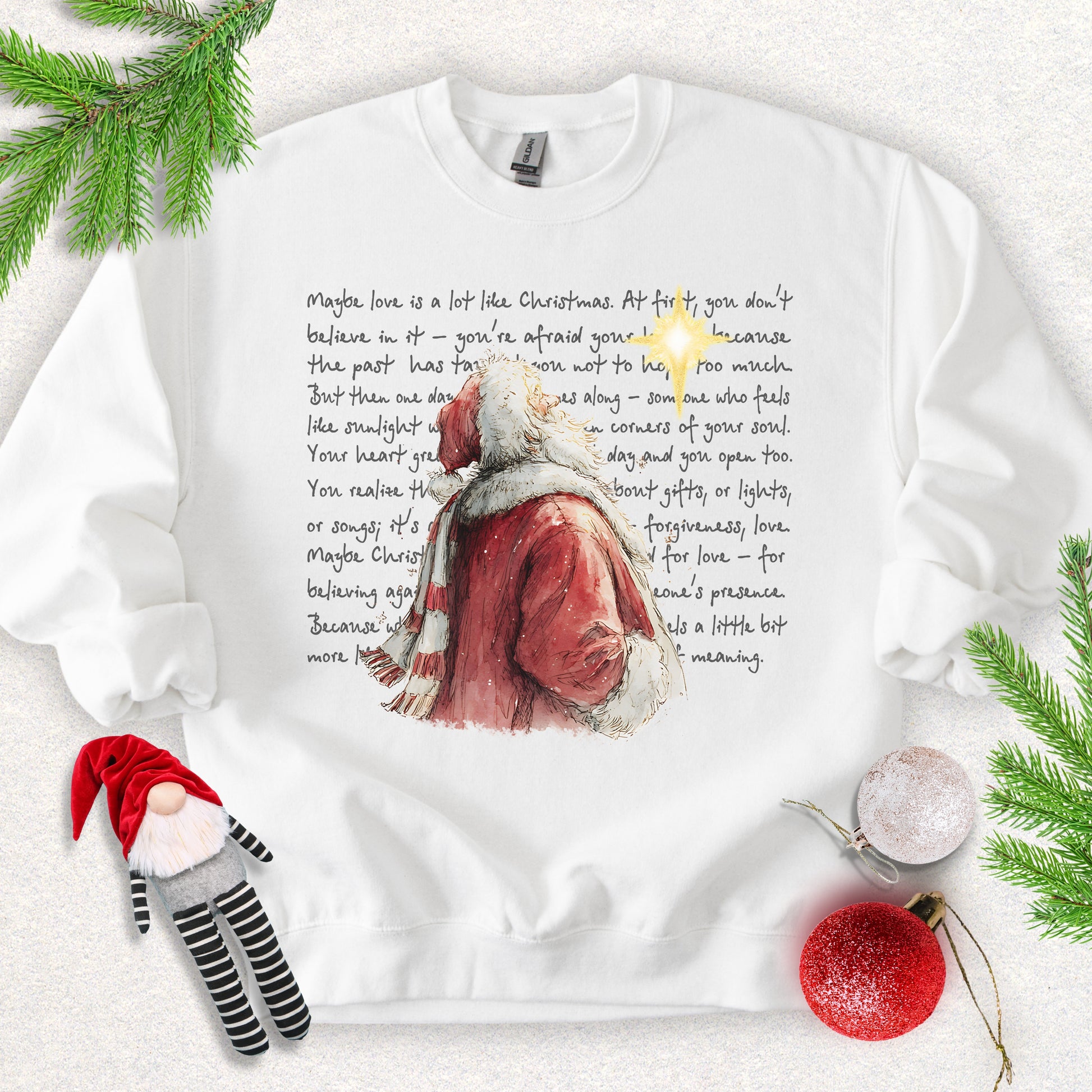 This cozy crewneck brings a quiet, nostalgic holiday scene into your everyday wardrobe. Soft white fleece cradles a gentle watercolor illustration of an older Santa looking up toward a single glowing star, layered over handwritten script that feels like a remembered letter. Wear it for slow mornings with coffee, evening walks under string lights, or curled up with a book — it holds warmth without shouting. The classic fit and crew neckline keep the silhouette clean so the art stays the focus, while the medium-heavy blend keeps you comfortably insulated on chilly days.