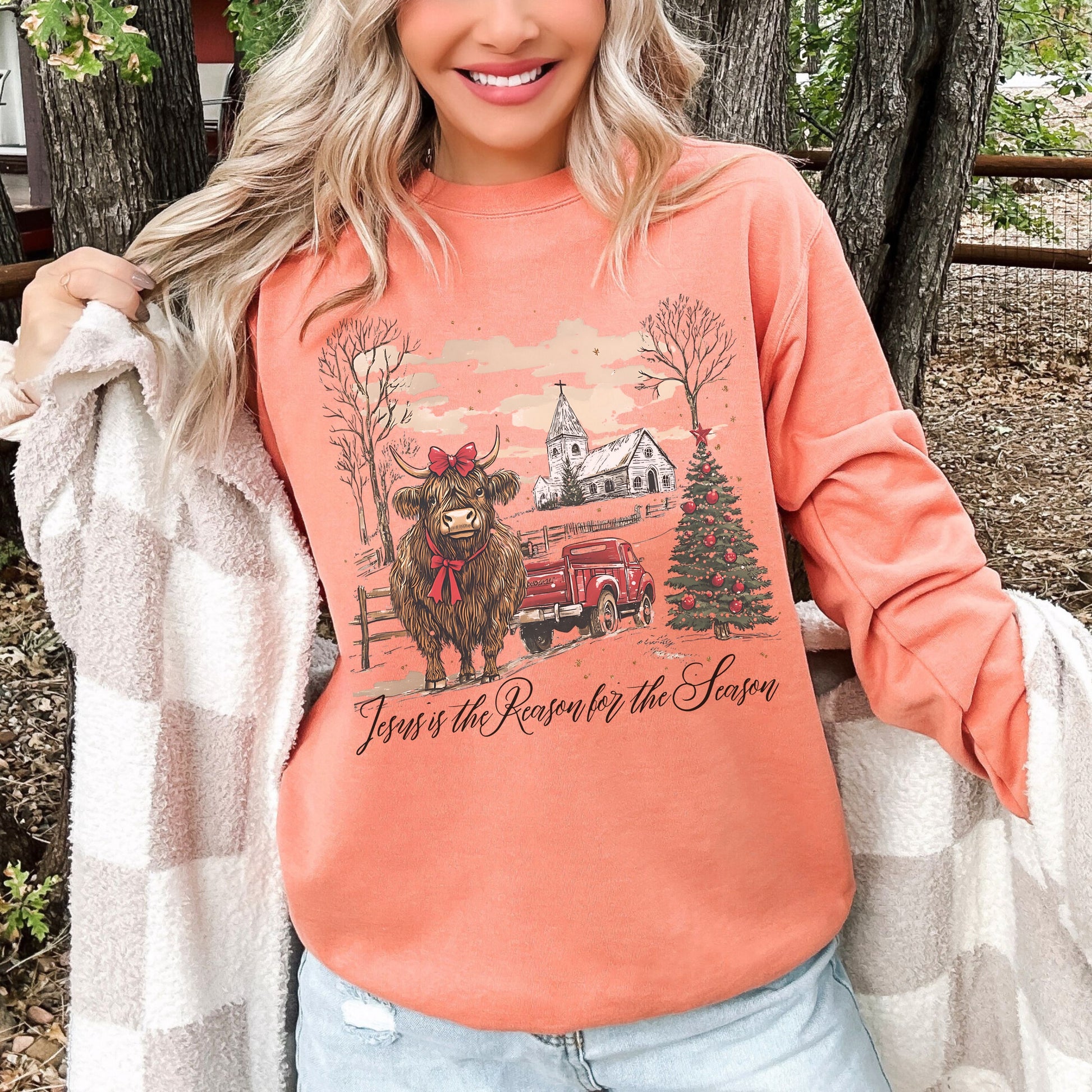 A light, relaxed sweatshirt that brings a cozy country-Christmas scene to quiet winter days. The soft, breathable cotton surface carries a hand-illustrated print: a ribbon-bowed bison beside a vintage red pickup, a decorated evergreen, and a snow-dusted church on the horizon. Wear it while trimming the tree, running last-minute holiday errands, or settling in with hot cocoa and a board game. The relaxed fit layers easily over tees and flannels without feeling bulky, and the subtle vintage palette keeps the look warm and lived-in rather than flashy. Thoughtful construction—ribbed cuffs and hem, taped shoulders, and a tubular knit—means it keeps its shape and prints beautifully wash after wash.