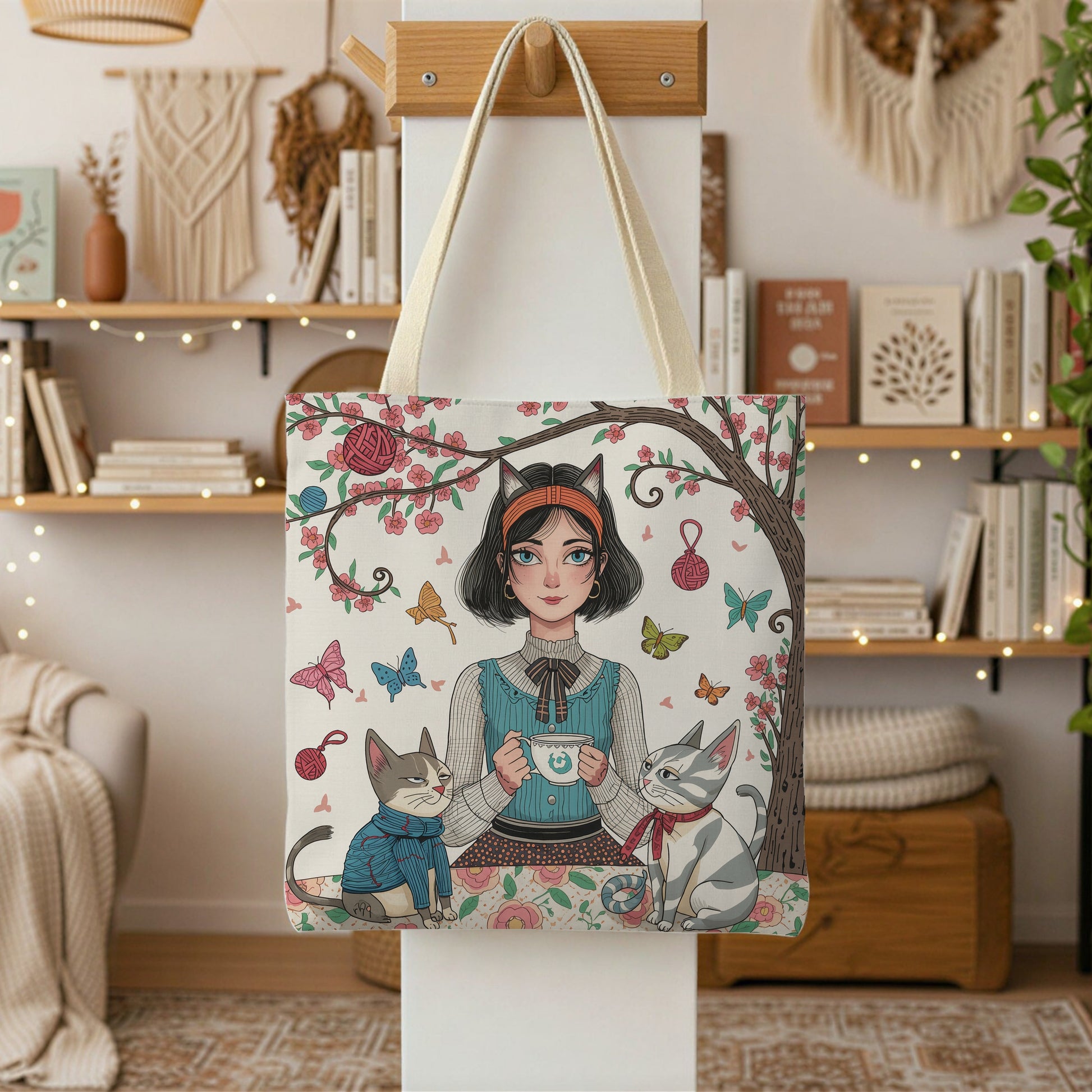 Soft, whimsical, and full of cozy charm, this illustrated tote bag is made for cat lovers, bookish souls, and anyone who finds joy in quiet rituals. Featuring a gentle storybook-style illustration of a cozy coffee moment shared with feline companions, this design blends cottagecore warmth with playful, artistic detail.